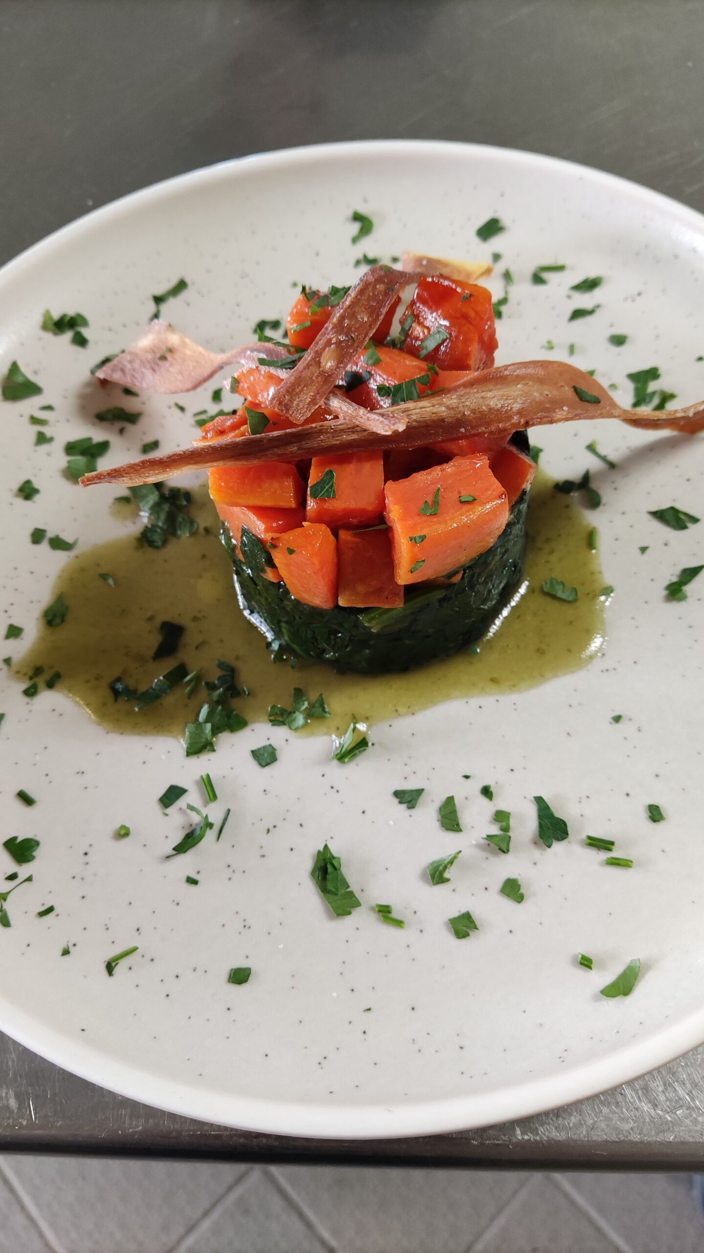 die Hauptspeise (z.B. Wildkräuterspinat mit Sesambuchweizen und Feta)